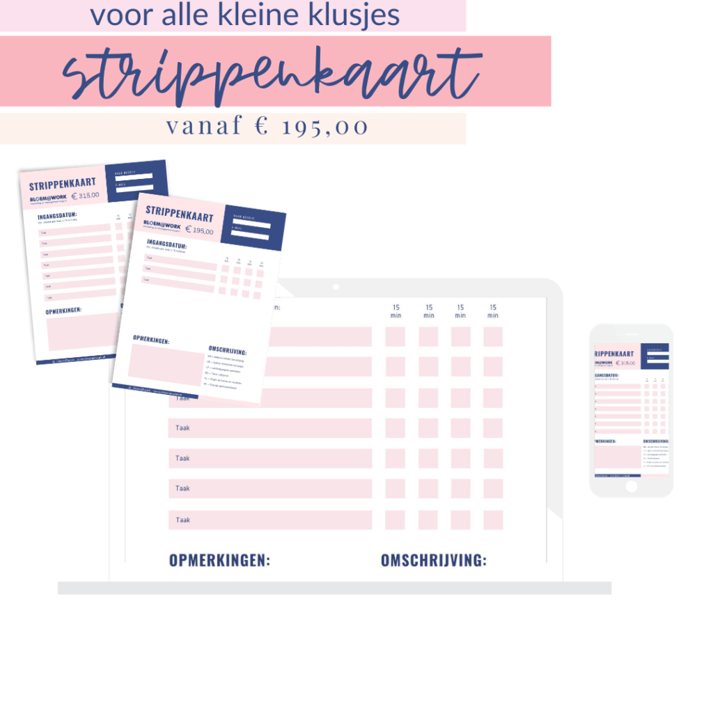 €195.00 – €315.00 Opties selecteren Dit product heeft meerdere variaties. Deze optie kan gekozen worden op de productpagina€195.00 – €315.00Klanten vragen me vraag om even iets te doen, na te kijken of op te zoeken. En dat doe ik natuurlijk graag. Maar met elk verzoekje ben je toch even bezig. Daarom werk ik vanaf nu met een “strippenkaart” voor al deze kleine klusjes. Duidelijkheid voor jou en mij. En de prijs is uiteraard excl. btw.
